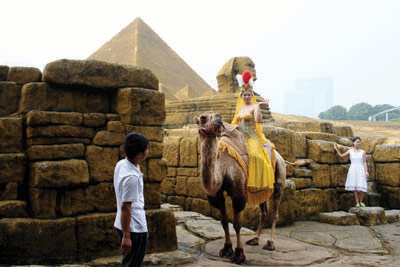 微型吉扎金字塔对面,一个旅客穿埃及式样的服装坐在骆驼上