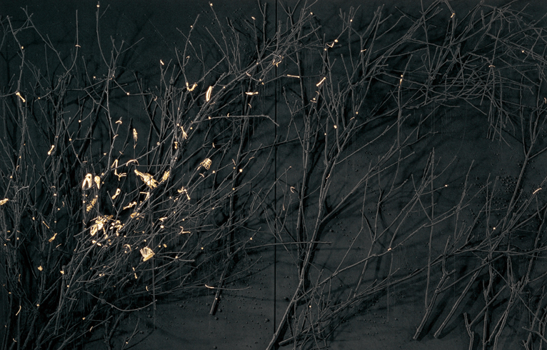 Next Imagelintianmiao_featureimage The Black Sameness (detail), 2011, Black cashmere, branches, animal skeleton, gold foil,cotton cloth, linen cloth, 476 x 161 cm