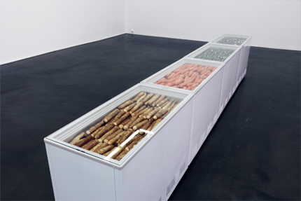 《致S》,2012年,装置,冰柜、黄瓜、茄子、胡萝卜、白山药,458×55.5×83厘米