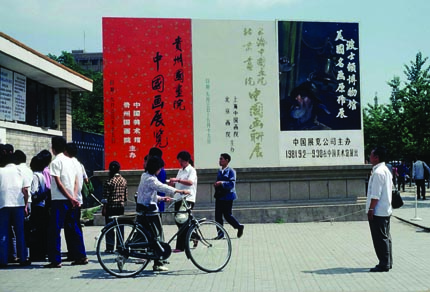 观众在中国美术馆门口排起长队等待买票, 远处可以看到本次展览的海报。