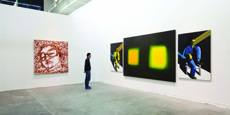 展览现场,2012年,上海民生现代美术馆,从左至右:邱志杰,《童年:金正日》,2012年;汪建伟,《表面的肖像》,2011年