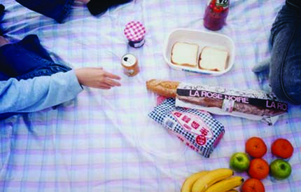 《星期天下午:与友人和手绘布于香港西贡榕树澳野餐》,2003年彩布面丙烯,摄影纪录,尺寸可变