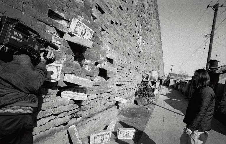 March 1995, early spring. I was invited to be one of the artists filmed for the German television station ARD’s documentary about the Chinese avant-garde. Because it had to capture me at work, I suggested that they kill two birds with one stone and record me shooting Wang Pu as he set up his installation, which consisted of Wang reinserting bricks from the Imperial Palace, plastered with American money, back into its ruined outer walls. On the left is the ARD photographer, and Wang Pu is on the right.