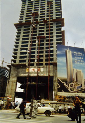 May 1995, Guangzhou. Lin Yilin’s performance Safely Crossing Linhe Road. A freelance photographer at the time, I was working on a feature on Chinese avant-garde art for the German magazine Stern. Stern photographer Hans- Jürgen Burkard (crouching on the right; standing on the right is me) and I traveled together to Guangzhou to shoot. I planned the trip beforehand with the artists, and all of them did something for me to shoot. The four artists of the Big Tail Elephant collective all prepared new works, becoming the very reflection of my camera lens.