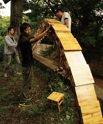 Previous ImageNext ImageTZ’U-MAN_4 Bridge, by Zhang Yu, creates a narrow bridge spanning 4.2 meters of water using 27 square stools borrowed from Tz’u-man’s Association of Elders.