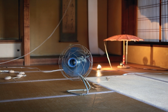 Previous ImageNext ImageMohri4_2 Circus in the Ground, 2014 Compass, fossil, chime, bell, garden funiture, feather duster, ruler, light, umbrella, gut, motor, light bulb, roll paper, approx. 250 x 1200 x 1200 cm PHOTO: Yuko Mohri