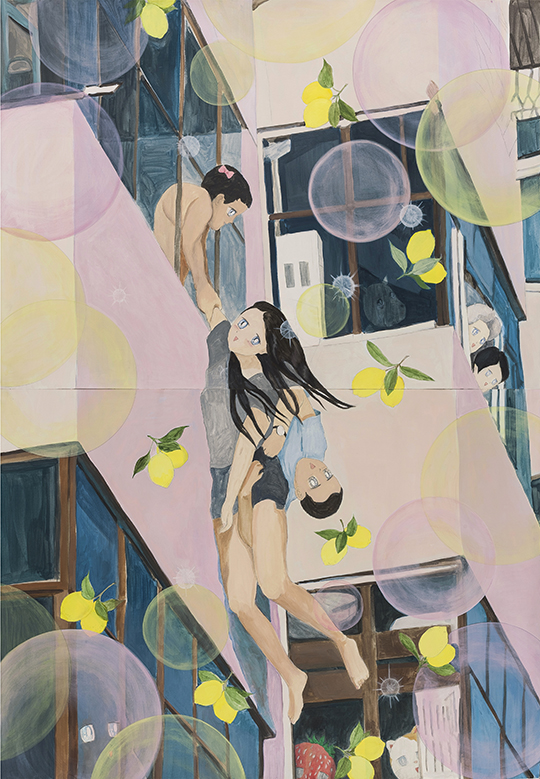 Previous ImageNext Image20151223e Woman Jumping off Building, 2015, acrylic and pencil on paper, 109.2 x 157.4 cm