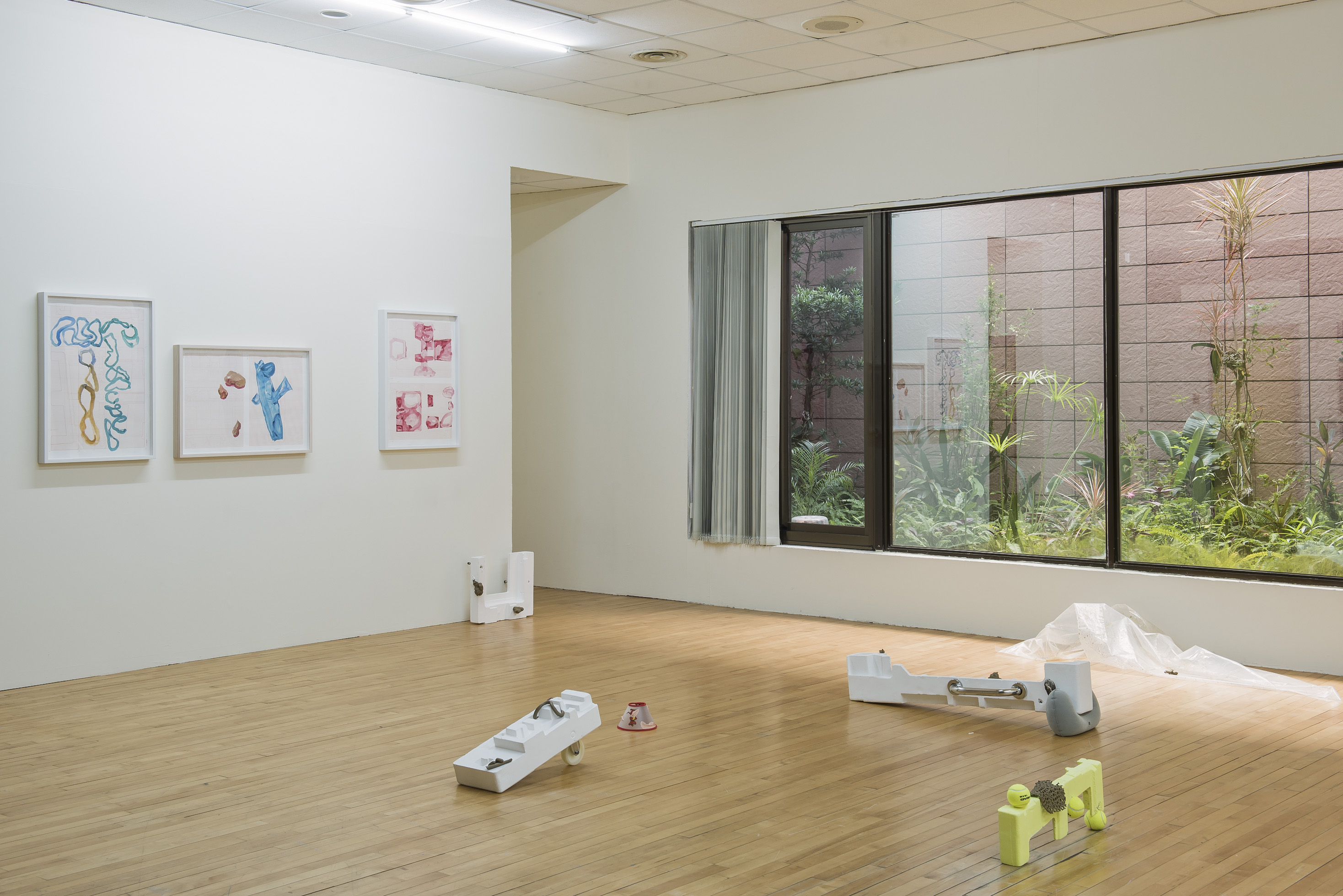Installation view, Luo Zhixin, Foam to Form, 2015, ink on paper, wooden frame, charcoal, pencil, watercolor, acrylic, plaster, clay, gauze, plastic sheeta, shells, minerals, handrails, wheels, bolts, ready-made objects