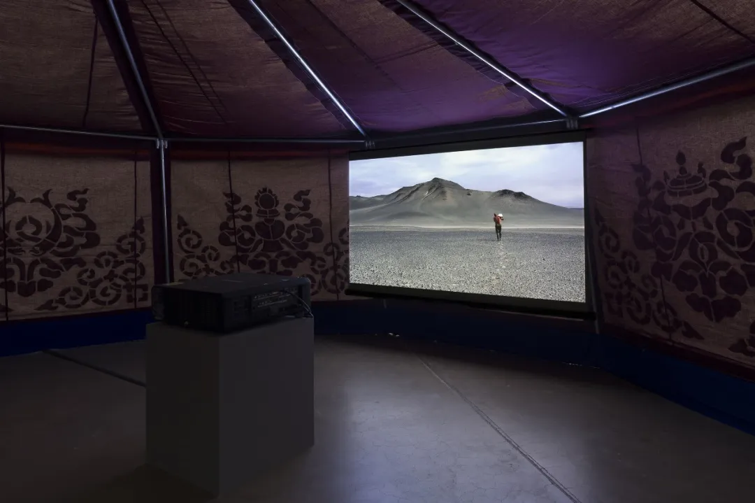 Zhuang Hui’s solo exhibition, “Qilian Range, Redux,” curated by Karen Smith, opened on April 24, 2021 at Galleria Continua, Beijing. The exhibition was both a continuation of the eponymous show curated by Colin Siyuan Chinnery at the same venue four years prior, and a showcase of Zhuang’s recent work. Zhuang traveled alone—by car and on foot—through the Hexi Corridor, where he was born and raised. A video installed inside a yurt in the exhibition hall shows him attempting to lever a massive rock with a wooden stick (Qilian Range-22, 2019). He wandered naked through the Hexi Corridor and the Qilian Mountains, striking a gong (Qilian Range-26, 2019). He also engraved QR codes into rocks at five separate sites—human traces that would guide those who “discovered” them in the vast wilderness toward local knowledge and histories tied to the Qilian Mountains. In the exhibition, the artist surrendered both his body and mind to the mountains. These actions, though seemingly futile, were gestures toward freedom: the artist would not forgo action simply because he understood the rock would remain unmoved. Instead, he found release in the wilderness and among the mountains. Writing in ArtChina about Zhuang’s 2017 solo exhibition, art critic Li Fan observed: “The distance between man and mountain is relatively vague and ambiguous. It’s hard to say whether it is man who roams the mountains, or whether the mountains are human by nature—who serves as whose backdrop, and who becomes whose annotation… The posture here is open, allowing any childlike spirit to run wild.”