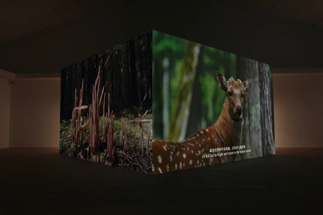 In the same year, Liu Yujia’s “A Darkness Shimmering in The Light” curated by Mia Yu at Tang Contemporary Art featured the eponymous video work projected on a large screen in the main gallery. Although the artist listed several anthropological and ethnographic works in the credits as influences, including Soul Hunters (2007), The Mushroom at the End of the World (2015), and Shamanism, Colonialism, and the Wild Man (1991), and the film also demonstrated her interest in the livelihoods and ritualistic beliefs of local people in the region of Changbai Mountains, the artist preferred to call her creative approach the “travel videography.” In her working method, “travel” distances itself from the currently popular model of “research-based art.” It is more akin to “entering a regional area empty-handed,” retaining the author-centric tradition of the travelogue: Daoist priests practicing martial arts, deer roaming the forest, shamans communing with spirits—all recorded by the artist’s camera, yet “transformed” into “stories” through the artist’s imagination. She once stated, “Many stories in the exhibition might simply appear as documentary snippets in terms of visual images, but their function is absolutely not to provide documentation. It is rather a kind of creation. This is not about how to translate reality, but about how you perceive and imagine reality.”[2]