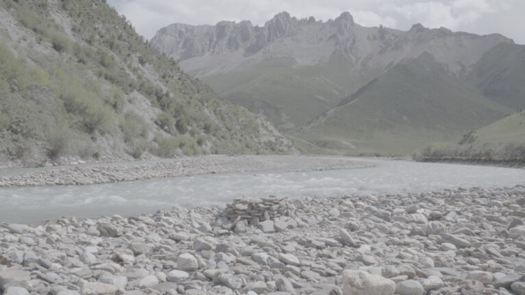 在一次行程中,我们沿路经过青海囊谦——一处介于旅程两地之间的山地河谷,赵要曾将他的抽象唐卡安置附近的山地。这里也是艺术家童文敏进行表演的地方,她选择了怒江源头的一条支流河谷(南阿怒语称其为“Anung Remai Zmai”),在一座石屋中完成仪式性动作。她的表演依赖直觉,而这次的经历让我感受到这些山脉所蕴含的巨大能量。