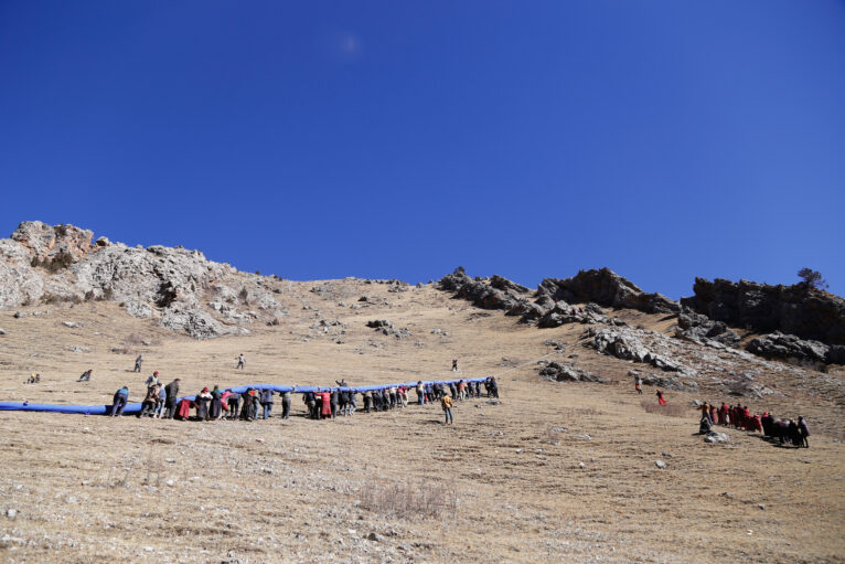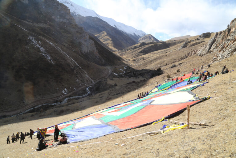 2016年11月23日早9点至晚6点,在摩耶寺与卡则村的150多僧众的协力下,面积接近10000平方米的《精神高于一切》被搬运到海拔接近5000米的曾尕尔山顶展开并固定。