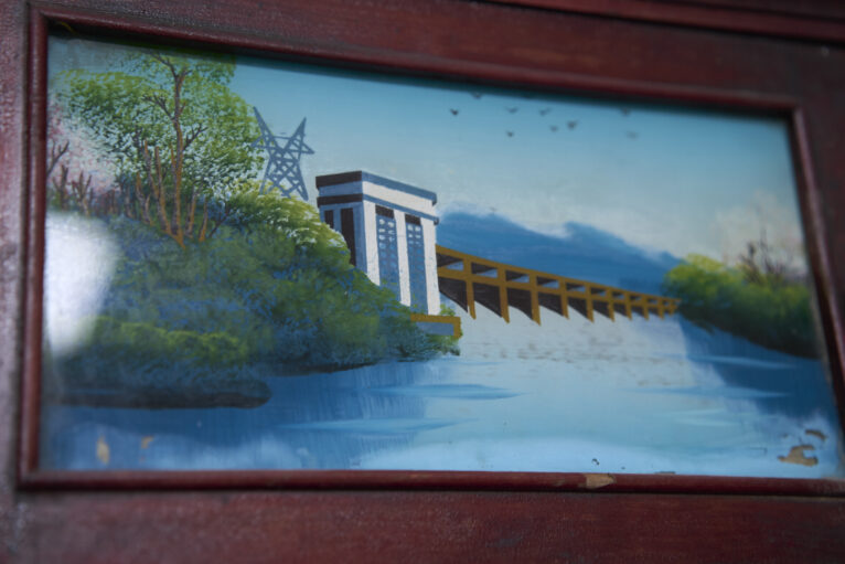 我们一行人还未从漫长车程中缓过神儿来,于是先参观起了他平时画画的小角落,还有他用旧运输木箱和淘来的清末老木柜改造成的家具装置。他仔细地向我们介绍柜门上那些已经褪成青色的玻璃画,家具装置的凹龛里还摆着一尊来不及拥有面孔的木雕像,粗粗毛毛地只雕出个轮廓,但它的性格却在杂密无章的木质纤维中呼之欲出。客厅的茶台上也放着他从各地捡来的“宝物”,有松枝、木瘤和各种石头。他对此都津津乐道,唯独对茶壶里的茶毫无头绪。他一边给我们泡茶,一边心满意足地在对面喝着可乐。