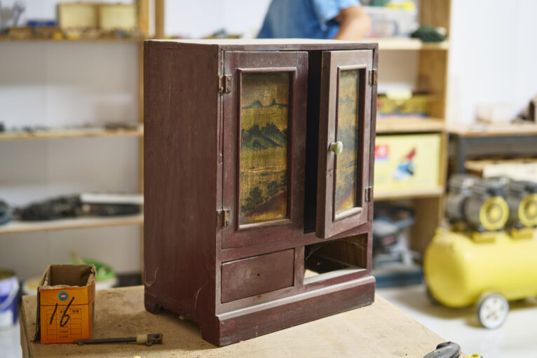 梁硕:这些是我还没弄好的“渣藏屋”的展柜,我可能确实有点遗传家里老人的习惯,一点点小木头块也留着。八、九十年代的电视柜,我主要找那些表面带画的,是奔着画才买的柜子。有些是我收拾过的,得整个给它翻新一遍:还能用的板子就拿细砂纸给它打磨一遍,好好擦干净,把那些陈年老泥都给清了,破板子就拆掉换成干净的。我当时在上海做展览(“梁硕:来虩虩”,上海新世纪当代艺术基金会·瓷屋,2017)的时候收过一批,后来还去了一次沈阳,收了很多东北风格的。北方柜子没有太多装饰,但上面的画当时估计学了点日本画的语言。