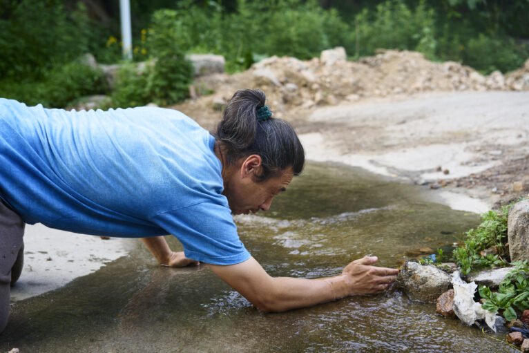 穿过隧道,溪水横流在隔壁村庄入口的路面上。梁硕俯下身来,用前臂拦截水流,像一道大坝