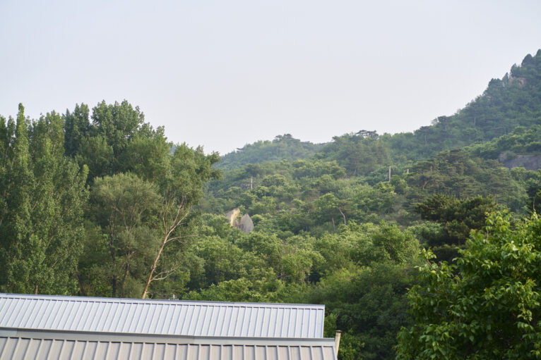 梁硕的工作室在距离北京市区往北约两小时的村庄里。出发前,我突然收到他一条毫无语境的微信:“能帮我带瓶可乐么。”于是我带着一大瓶可乐上路了。午饭后的高速公路让人昏昏欲睡,我完全错过了从城区到郊区的风景,身体就这样被传送到了一个在北京,但又可以是任何一个在北方的村落。这里的确买不到可乐,也没有任何餐厅。进村后抬头望去,最高处的那栋蓝顶的房子就是梁硕的家,也是他和同为艺术家的伴侣所共享的工作室。这已经是我第三次拜访了,但我却头一次意识到,从客厅窗户望出去的那座山,就是银山塔林景区的那座银山。我迷失的身体仿佛一下子找到了坐标。前一天,梁硕特意嘱咐我们下午来,这样爬山的时候可以看到夕阳。