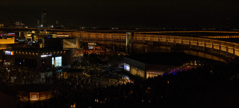 黄昏时分,参观者聚集在大屋根屋顶