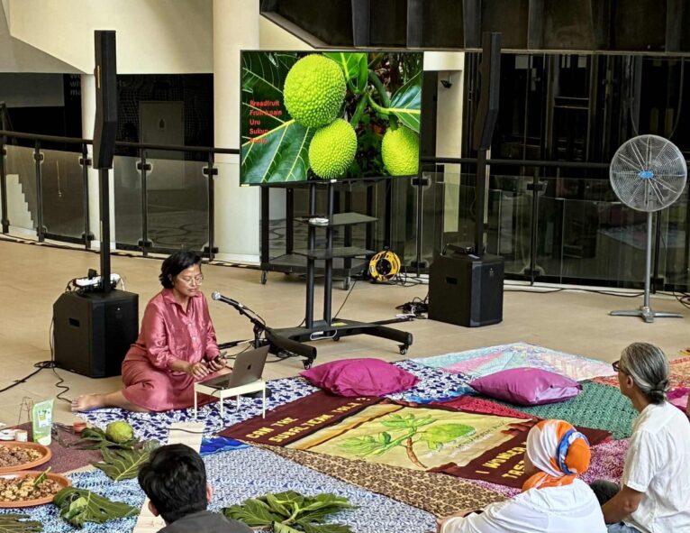 在印度洋和太平洋这片延绵的大海里,人们常常被迫或是自愿带着食物踏上没有归途的行程。这种单方向的宿命感似乎在人们拿起锅铲的一瞬间松了绑,让人没有那么无法喘息,并赋予人们抗争的自主权。在娜塔莉·穆恰马德持续发展的作品中,南岛语系的面包树不再单一,又冠上了自己以往多种多样的名字。她收集着面包树不同的名字、不同的过往、不同的食谱、在不同社群中的含义,让它再次活过来。在印尼文中,面包树叫做“sukun”,“sukun”这个词在阿拉伯语里又有宁静的意思。在印尼家庭房屋的门口也总有一颗面包树,喂饱这个家。穆恰马德在刚开幕的日惹双年展中展出的《sukun,我们一起叛变》(sukun, let’s mutiny, 2025)脱离了邦蒂号的叙事,烹饪和分享面包树之余让观众在绣着“sukun”名字的靠枕上小歇,以静制动。