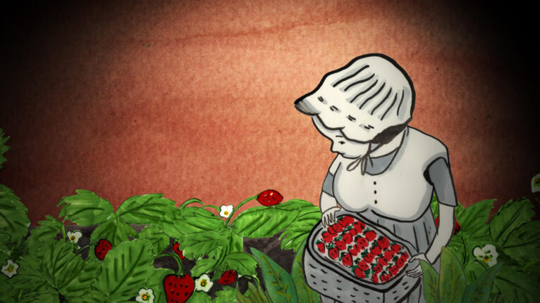 The expansion of frontiers always seems to be connected with claiming and plowing land. Only the land we can control with our own two hands seems real and reliable. This story continues until the latter part of the 20th century. Japanese Canadian artist Cindy Mochizuki dedicated a series of multimedia installations to tell the stories of Japanese farmers who have crossed the Pacific to cultivate land in Canada, and the unfair treatment they received during and after WWII. The memories and stories of Fraser Valley strawberry farmers became the main narrative of the hand illustrated feature animation film Autumn Strawberry (2021). What happens with crops and farmers in Canada, this vast and seemingly new federation stretching from sea to sea and disconnected from the old world, is always entangled with diasporic experiences and racial conflict.