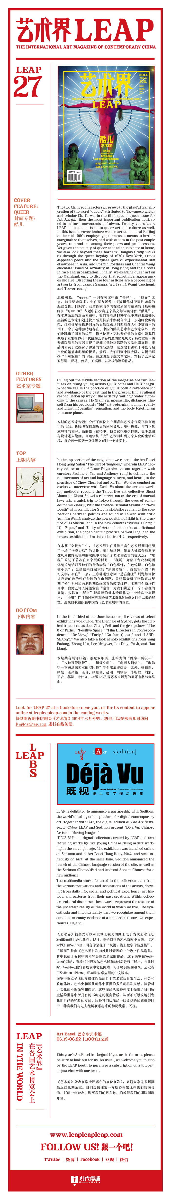 LEAP is the international art magazine of contemporary China. Published twice a year in Chinese and English, it presents a winning mix of contemporary art coverage and cultural commentary from the cutting edge of the Chinese art scene. It is a crucial platform that fosters critical and radical discourse on contemporary art and culture in China.